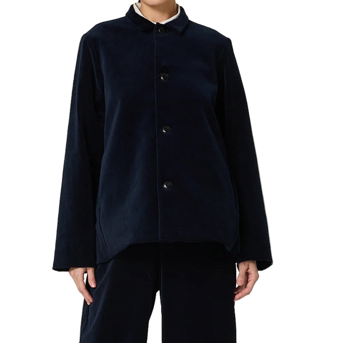 Long sleeve jacket with a petite collar, featuring slanted pockets and a button down closure. Cut in a rich custom dyed velvet. Lined in our crisp paper cotton.