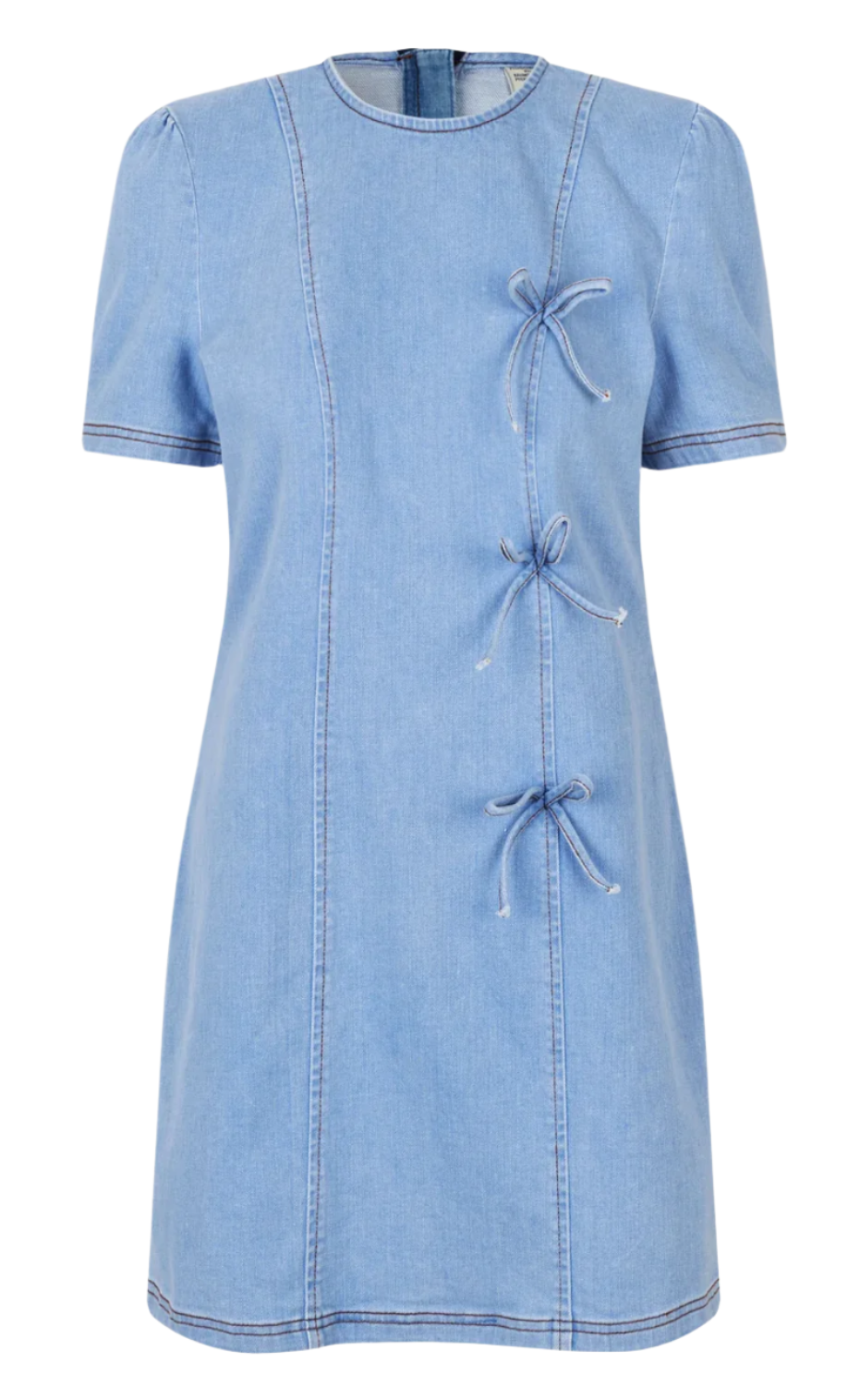 The Amali Dress is a stretchy A-line denim mini dress that effortlessly blends comfort and style. Featuring short, slightly puffed sleeves and bow detailing in the front, this dress adds a playful, feminine touch to your wardrobe and is perfect for both casual and dressed-up occasions.