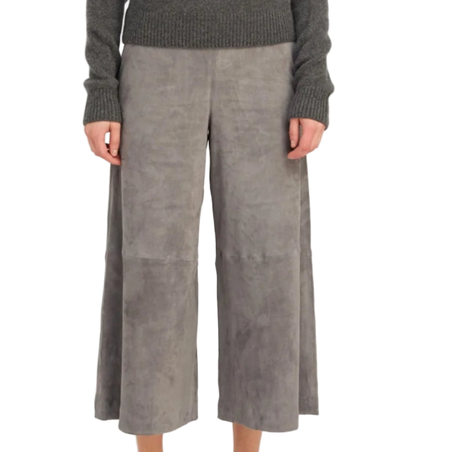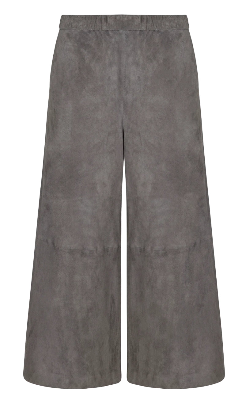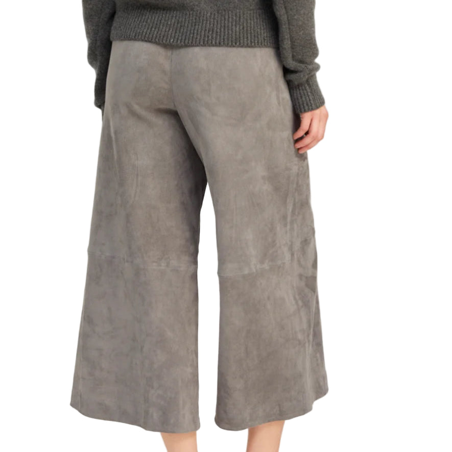 A classic high-rise wide leg pant, artfully cropped and designed with an easy pull-on fit. Made in our signature suede plonge leather, our culottes are buttery-soft to touch and extremely lightweight, while maintaining a structured and luxurious look. These pants are tailored with pintucks down the front and back for a lengthening look.