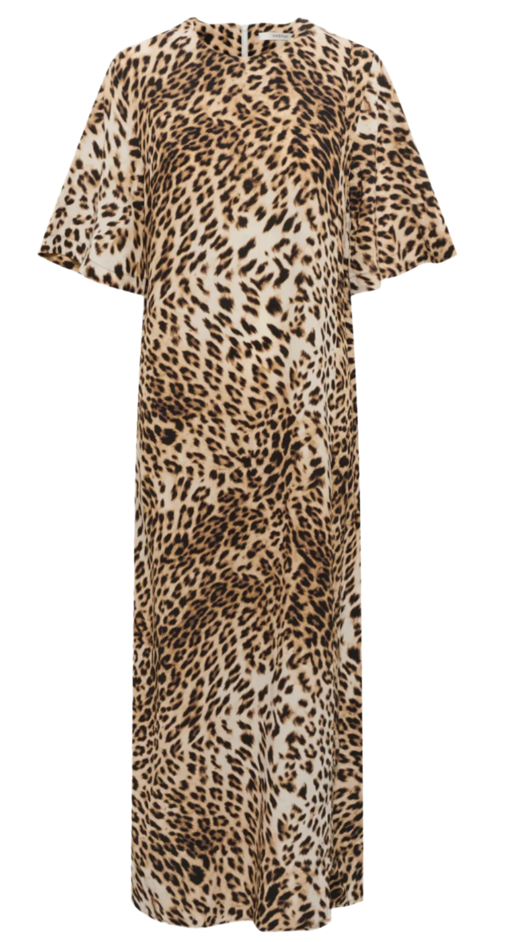 Midi dress with a relaxed silhouette, wide sleeves, and round neckline. Features a zipped side slit that can be worn open or closed for adjustable shape and movement.