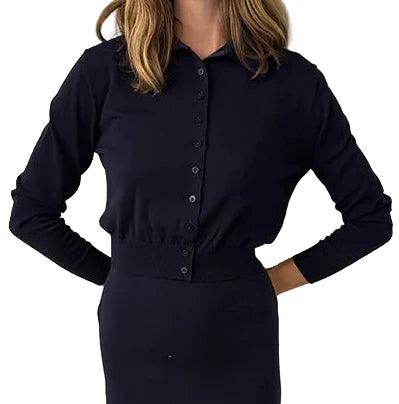 The Palma Cardigan in Midnight is a button down long sleeved sweater. Similar to our best selling Hydra Cardigan, but we added a collar and went with the perfect moody midnight hue.